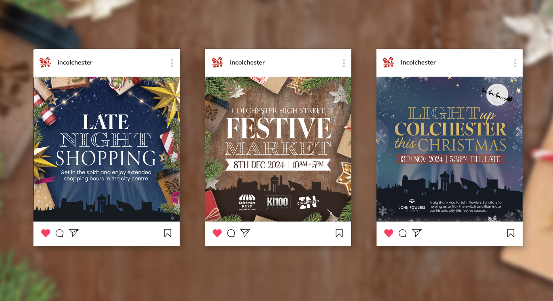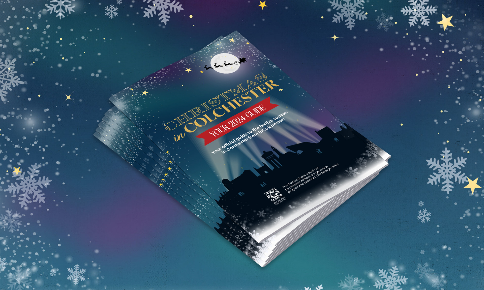 For the 2024 In Colchester Christmas Campaign, I wanted to create a design that felt festive and magical while still being rooted in the identity of the city. The visuals feature a bold silhouette of Colchester’s most recognisable landmarks, set against a starry winter sky with snowflakes, twinkling stars, and Santa flying past the moon. This mix of local character and festive charm gave the campaign a strong sense of place and instantly recognisable style.
