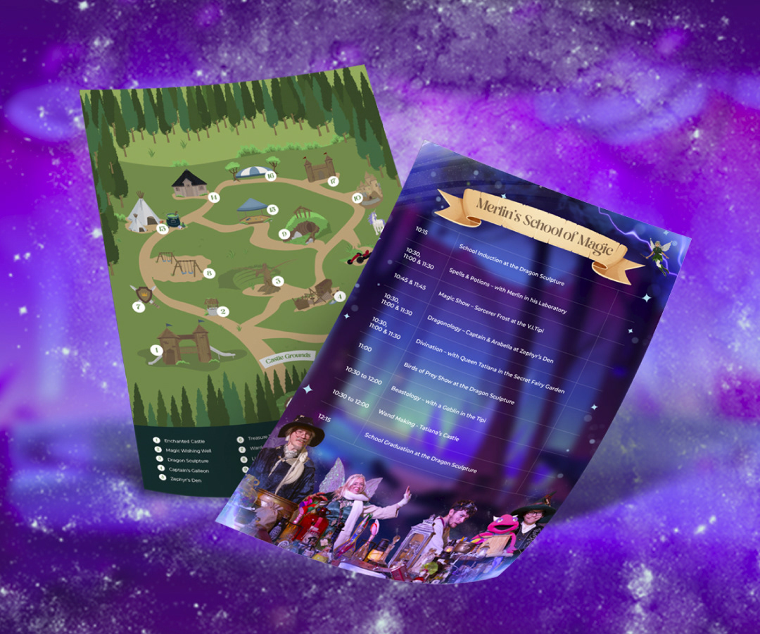 For Wyvernwood’s February half term event, “Merlin’s School of Magic,” I designed a vibrant purple-themed look that brought a touch of magic and mystery to the park. The concept centred around a glowing portal, creating a sense of stepping into Merlin’s enchanted world.