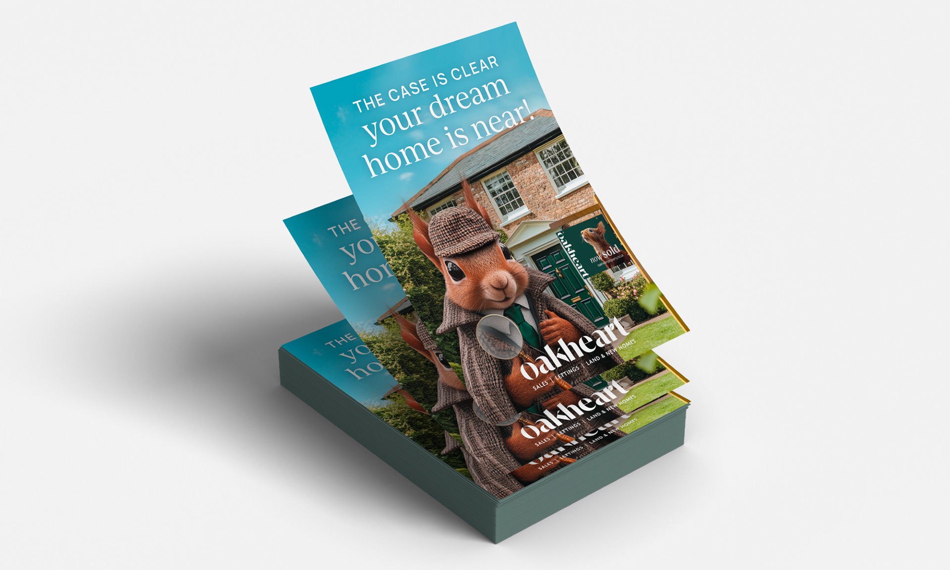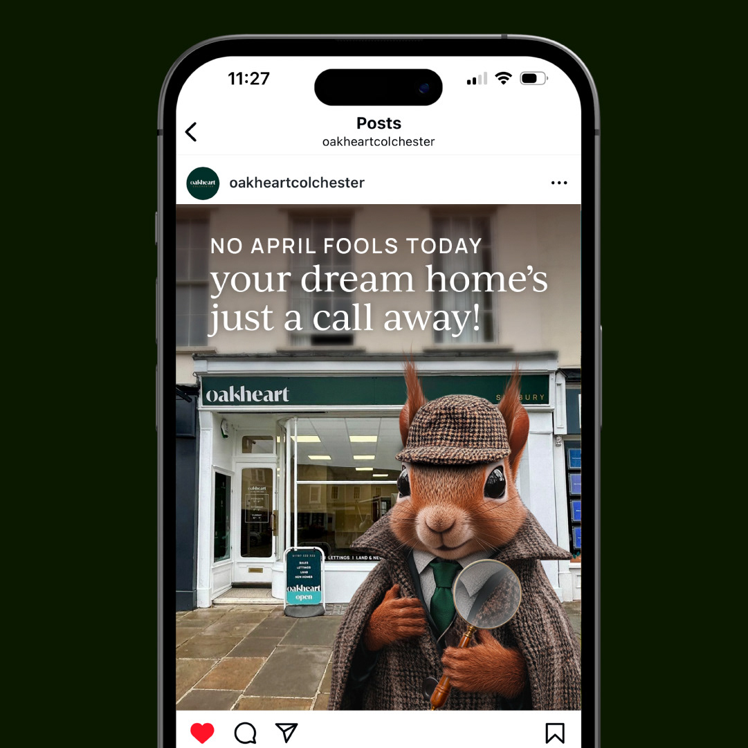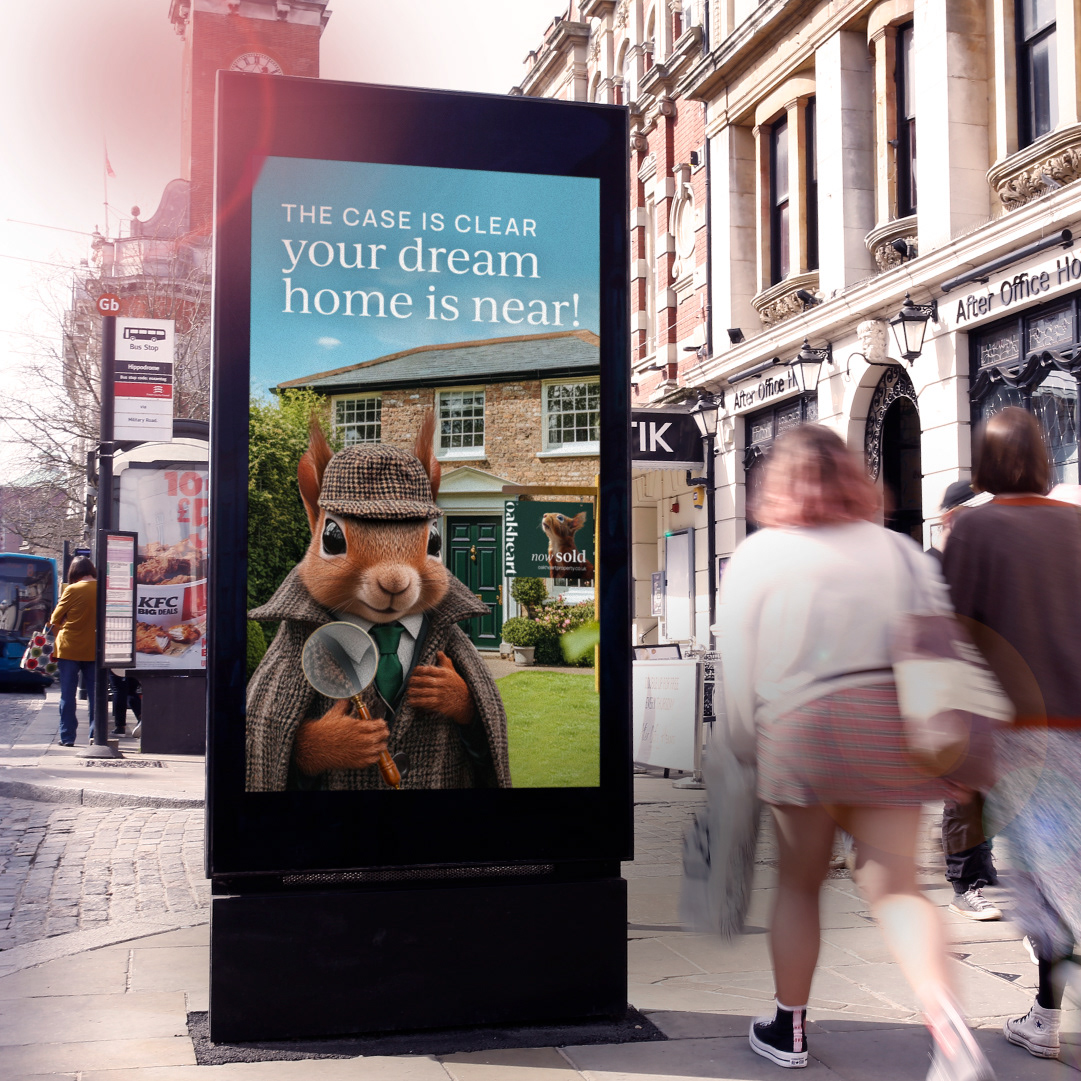 For Oakheart’s Spring campaign, I designed a full suite of creative inspired by the world of Sherlock Holmes; starring their clever red squirrel mascot, “Sherloak.” From concept to execution, I brought Sherloak’s detective flair to life through social media posts with magnifying glass in paw, digital screens and banners, and sleek flyers and email signatures that keep Oakheart top of mind. Every detail was crafted to feel playful yet polished, making the hunt for a dream home as fun as it is seamless.