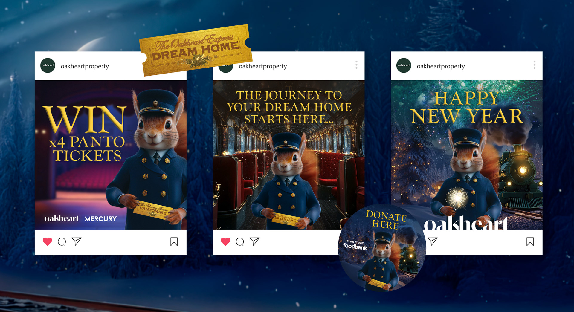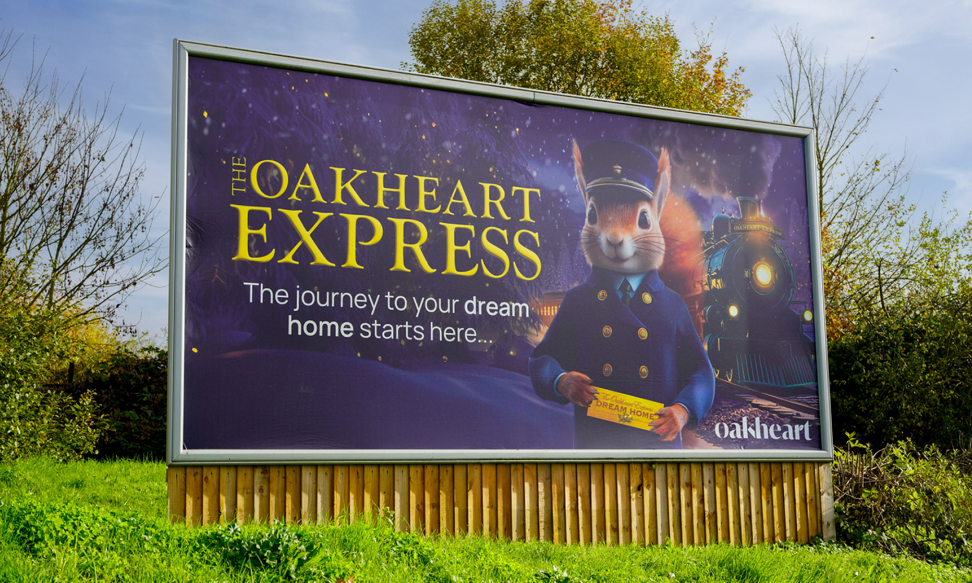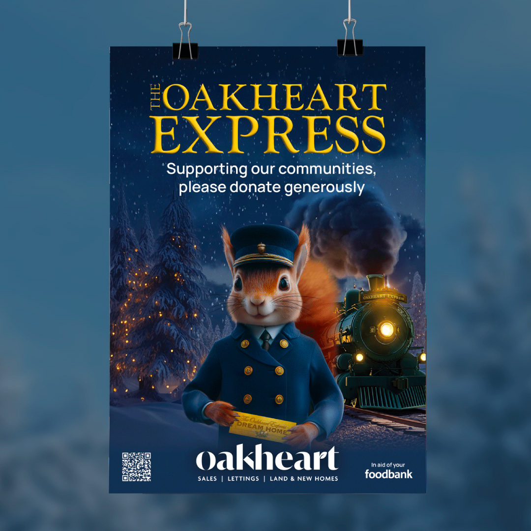 Not only did I come up with the concept for The Oakheart Express campaign, but I also got to bring it to life through design. The campaign follows Oakley, their squirrel mascot, traveling from Chelmsford to Colchester, Mersea, Bury, and Sudbury, spreading cheer, helping families find their dream homes, and collecting donations for local food banks.